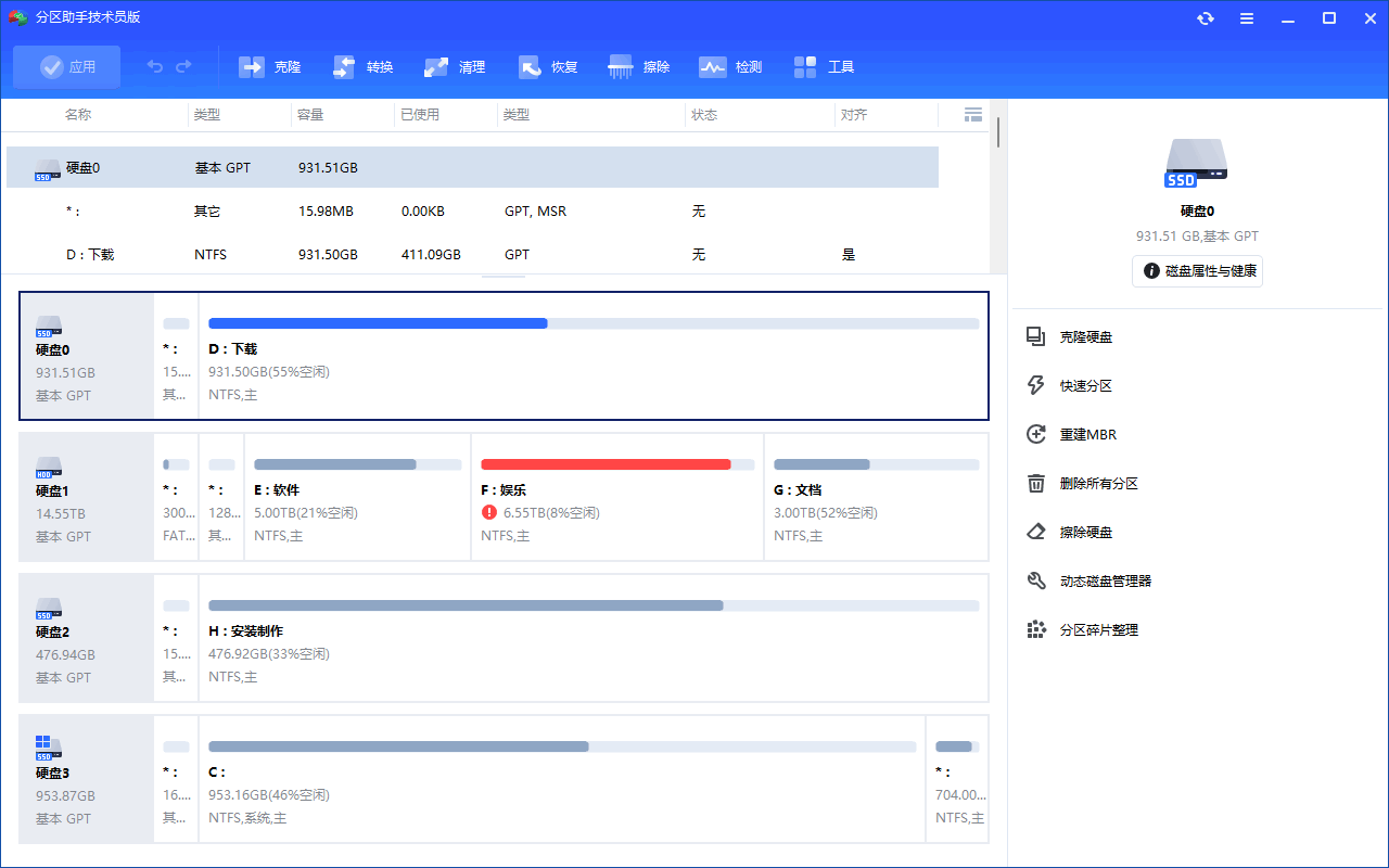 分区助手是一个简单易用且免费的磁盘分区管理软件,在它的帮助下,你可以无损数据地执行调整分区大小,移动分区位置,复制分区,复制磁盘,合并分区,切割分区、恢复分区、迁移操作系统等操作,是一个不可多得分区工具。它作为分区魔术师(Partition Magic)的替代者,它不仅支持Windows XP/2000/WinPE,还支持最新的Windows 7/Vista和Windows 2003/2008。不管是普通的用户还是高级的服务器用户,分区助手都能为他们提供全功能、稳定可靠的磁盘分区管理服务。