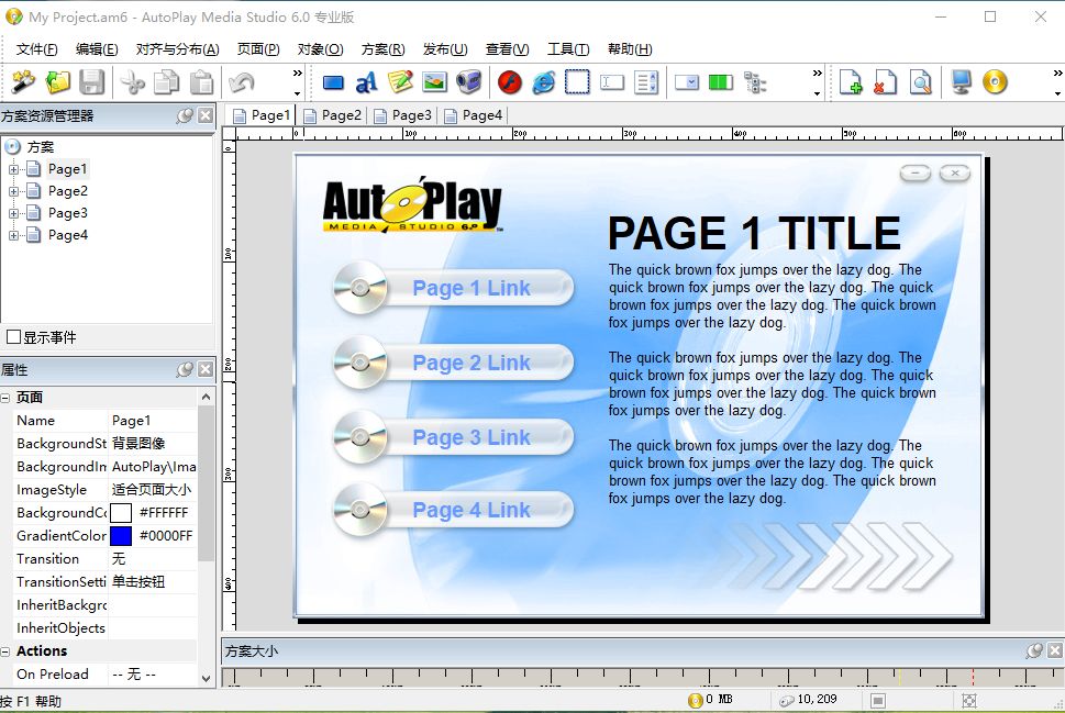 你肯定见过一些光盘自动播放的功能,非常漂亮而且实用,现在你也可以轻松创建非常眩目自动播放的光盘了,AutoPlay Media Studio 具备所有见机所得操作环境的光盘自动播放制作工具,预置应用广泛的的可重用模板,可以随心所欲的加入图片、文字和音乐,以及特效等。大大增强的制作环境, 支持 MEPG 播放,支持 Flash,无限次的 Undo/Redo,透明窗口。