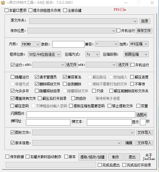 正文 单文件制作工具v7.0.2.3862 haiyang457 V管理员 /03-22 /1 评论 /87 阅读 0322 此篇文章发布距今已超过39天,您需要注意文章的内容或图片是否可用! 一个小巧强大的单文件制作工具,极大简化制作单文件的步骤,支持PECMD自解压模块、7zSFX模块打包,制作的单文件体积小,支持各种参数、文件防修改、打包解压加密、打包运行时无需额外的PECMD.exe。此处为隐藏内容,请评论后查看隐藏内容,谢谢!